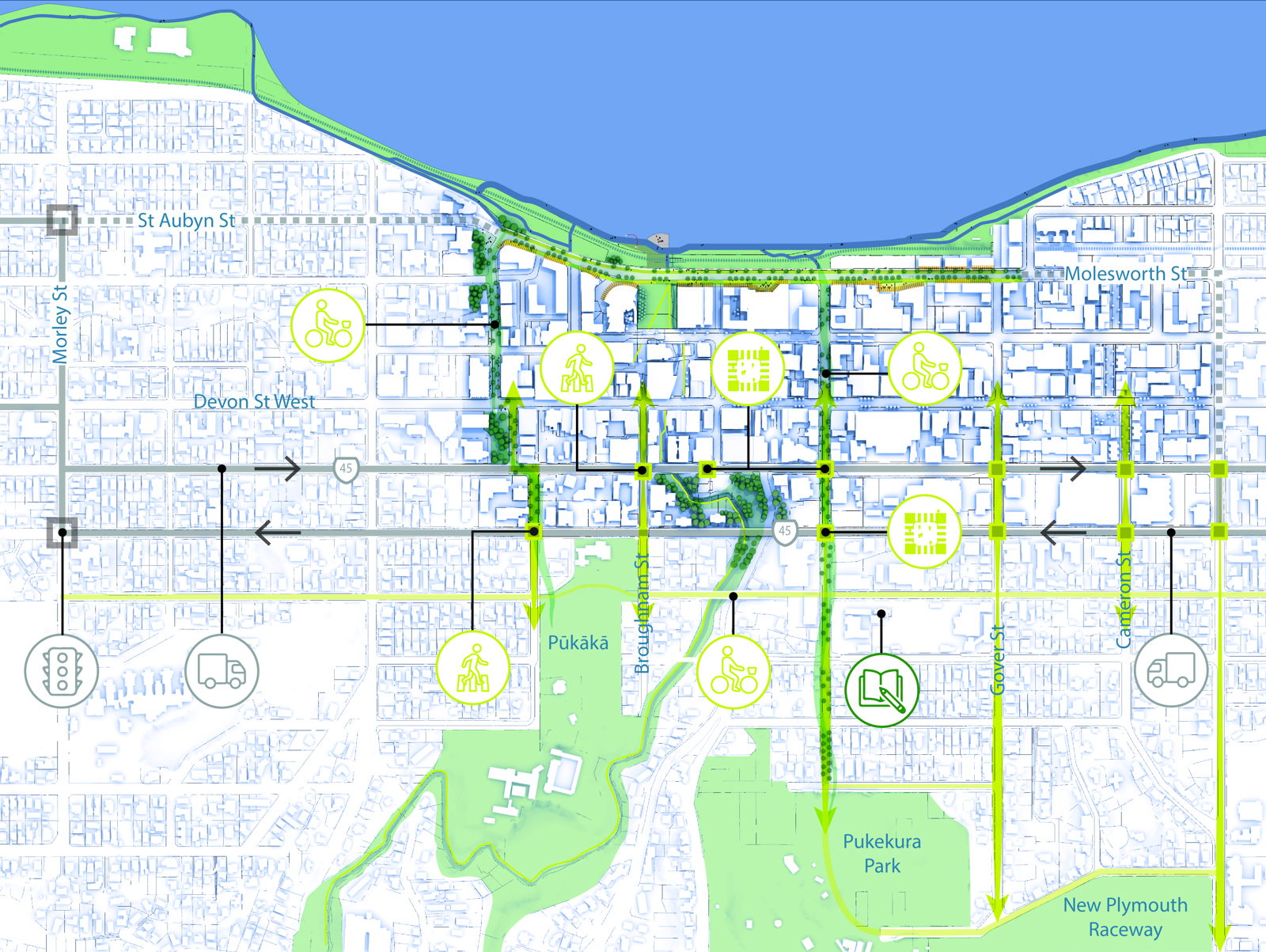 To make the city centre more accessible, walking and amenity upgrades for the north-south connections that link the city centre to its suburban edges are required. Upgrades along Robe, Brougham, Currie, Liardet and Gover streets as well as off-street connections at the Huatoki are proposed. The intention is to make these connections better for all ages and abilities, residents and visitors alike, and will include aspects such as new pedestrian crossings, intersection upgrades, priority phasing for better accessibility, footpath upgrades and under-road links at the Huatoki (see Key Move 1 - Restoring the Huatoki).